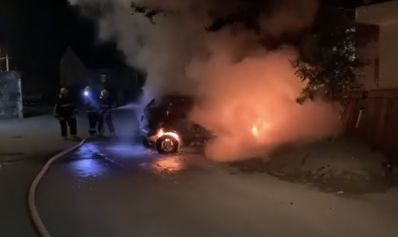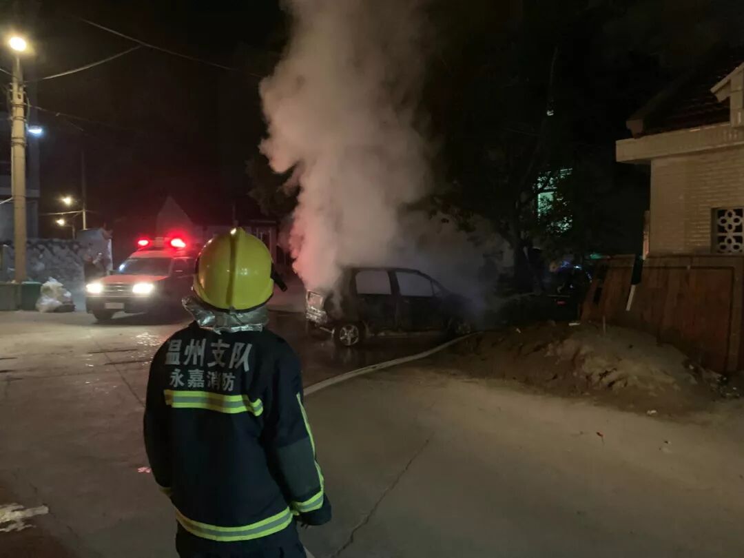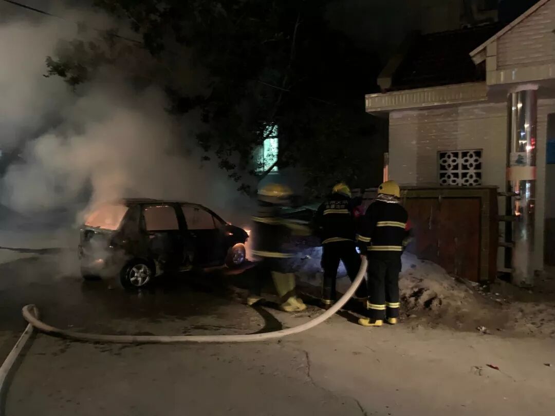 事发时间在凌晨2点多,这辆车停在河口村文化礼堂门口充电,突然自燃,后又自动向后滑行了约10米远。陈先生是第一个发现火情的人,他马上联系了村干部,并报了警。